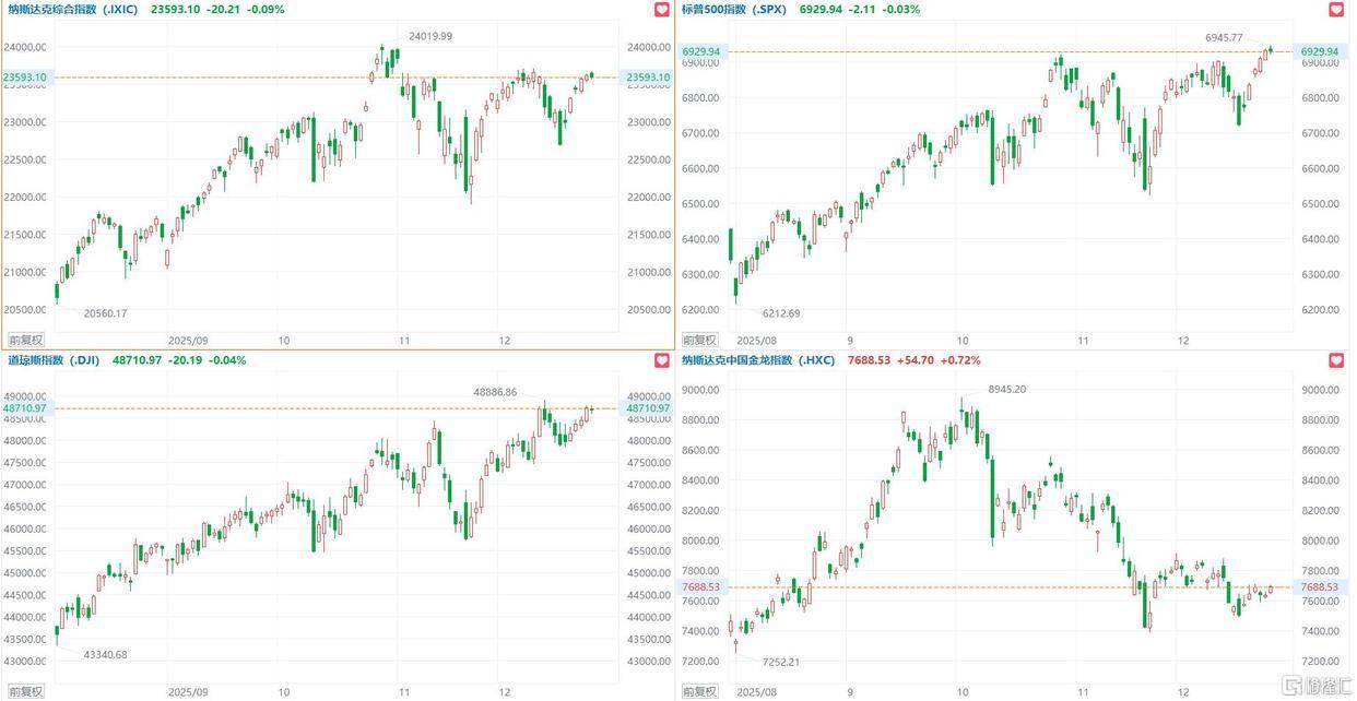 好意思股三大指数收盘均微跌,纳指跌0.09%,本周累涨1.22%;说念指跌0.04%,本周累涨1.2%;标普500指数跌0.03%,本周累涨1.4%。大型科技股涨跌不一,特斯拉跌超2%,谷歌、苹果、微软、Meta等小幅下降;英伟达涨超1%,亚马逊、奈飞、英特尔小幅飞腾。